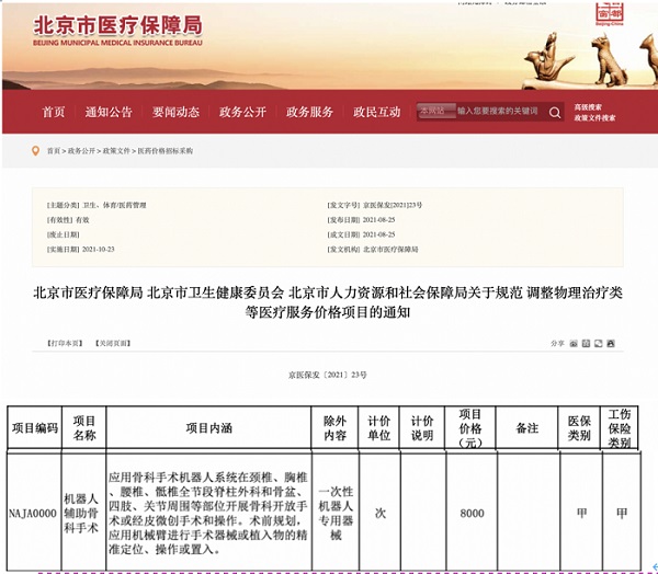 ③2021年10月23日,機(jī)器人輔助骨科手術(shù)進(jìn)入北京甲類醫(yī)保支付目錄(可100%報(bào)銷),一次性機(jī)器人專用器械獲得北京乙類醫(yī)保支付(可部分報(bào)銷)。相關(guān)支付內(nèi)容被分為兩部分,一部分為機(jī)器人的使用費(fèi)用,固定為8000元,可全部使用醫(yī)保支付;另一部分為配套耗材費(fèi)用,可部分報(bào)銷。與上海方案不同的是,北京將產(chǎn)品范圍限定為骨科手術(shù)機(jī)器人,但并未限定機(jī)器人廠商及手術(shù)類型,這讓適用范圍擴(kuò)大了許多,更多的患者和手術(shù)機(jī)器人廠商可從中獲益。